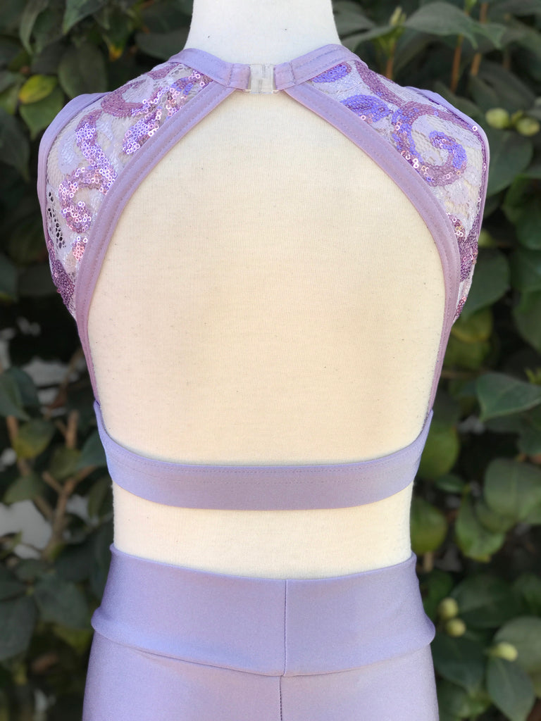Lavender Sequin Lace Crop Top With Triangle Open Back and Matte Trim.